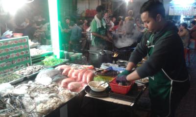 mache ich mich auf mit einem kleinen Boot über den Fluss nach China town. welch ein Straßenfest. ampein rot oder grün egal Leute und Fahrzeuge überall. für rund einen Euro bekomme ich ein großartiges essen, frisch zubereitet auf den fusswegen von China town.